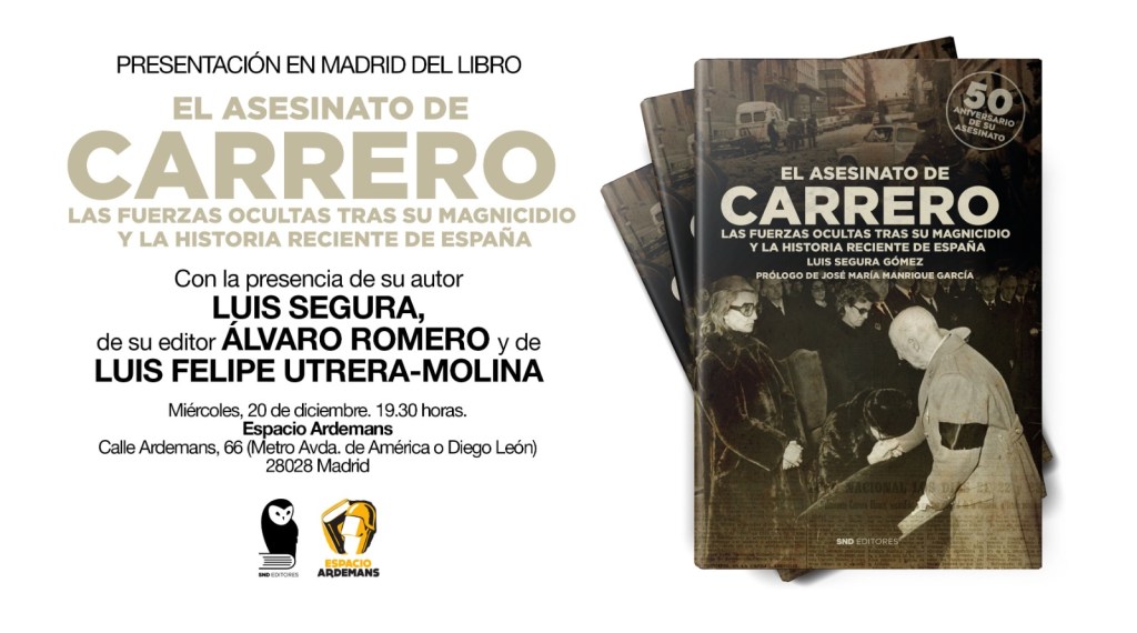 El 20 de diciembre de 1973 murió en el centro de Madrid, víctima de un atentado ostentoso y brutal, el que por entonces era el presidente del gobierno español, Luis Carrero Blanco. Cincuenta años han pasado ya desde entonces. Con la perspectiva histórica que nos proporcionan los años transcurridos, podemos apreciar las consecuencias del magnicidio, así como llamar la atención sobre hechos, documentos y circunstancias que permiten esclarecer aquel oscuro episodio, siendo posible afirmar con bastante precisión quién atentó contra la vida de Carrero, quién indujo el crimen y qué motivaciones tuvo. Después de dos años de laboriosa investigación, consultando archivos, hemerotecas y publicaciones bibliográficas diversas, la editorial SND Editores decidió publicar mi último trabajo: El asesinato de Carrero. Las fuerzas ocultas tras su magnicidio y la historia reciente de España, con prólogo del coronel José María Manrique, para el que este libro «es un libro valiente en el sentido pleno, que va a las causas y las señala, por muy raro, e incorrecto políticamente, que sea eso hoy en día (…) Un libro que aúna magistralmente una visión esjatológica de la Metahistoria con los hitos de las nuevas vivencias contemporáneas».