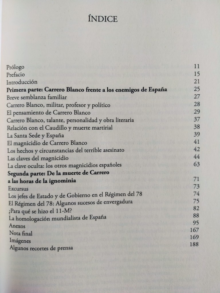 A continuación, refiero el índice de contenidos del libro, y también unos enlaces para poder adquirir esta obra. Además, con motivo de la publicación de la misma, en El caballero de los libros desarrollaré a fondo algunos de los aspectos de dicha investigación, El asesinato de Carrero. Las fuerzas ocultas tras su magnicidio y la historia reciente de España, iniciando así una nueva carpeta llamada Cuestiones históricas. En la mencionada sección comenzaremos analizando el magnicidio de Carrero Blanco, profundizando en las claves que a mi juicio permiten esclarecer su asesinato: ETA, Henry Kissinger, Juan Carlos de Borbón, la trama de encubrimiento, los otros magnicidios, etc., de manera que en adelante se vayan tratando otros asuntos relevantes de naturaleza histórica.